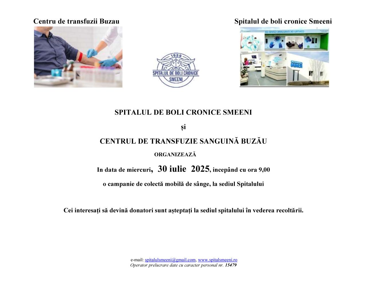 Spitalul de Boli Cronice Smeeni și Centrul de Transfuzie Sanguină Buzău organizează în data de miercuri, 30 iulie 2025, începând cu ora 9:00 o campanie de colectă mobilă de sânge